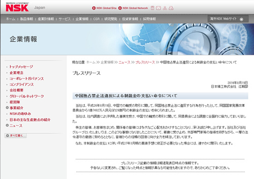 日本精工株式會(huì)社就因違反中國(guó)反壟斷法受罰發(fā)出的企業(yè)公告 據(jù)媒體報(bào)道稱,日本軸承制造商精工株式會(huì)社